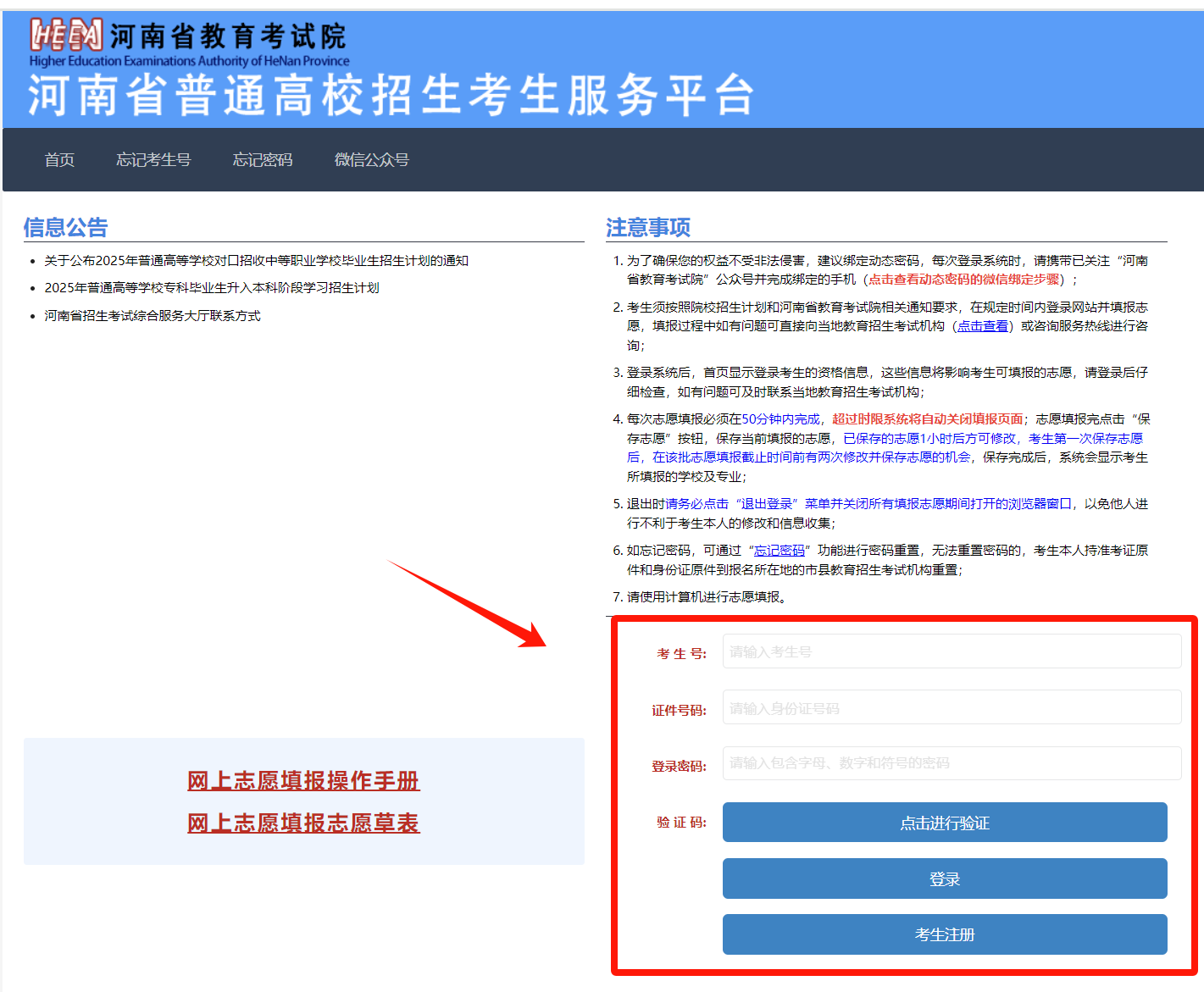 在考生登录区域输入考生的考生号、证件号码、登录密码和验证码,点击登录,登录普通高招服务平台。