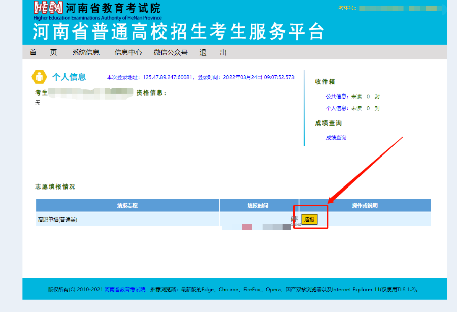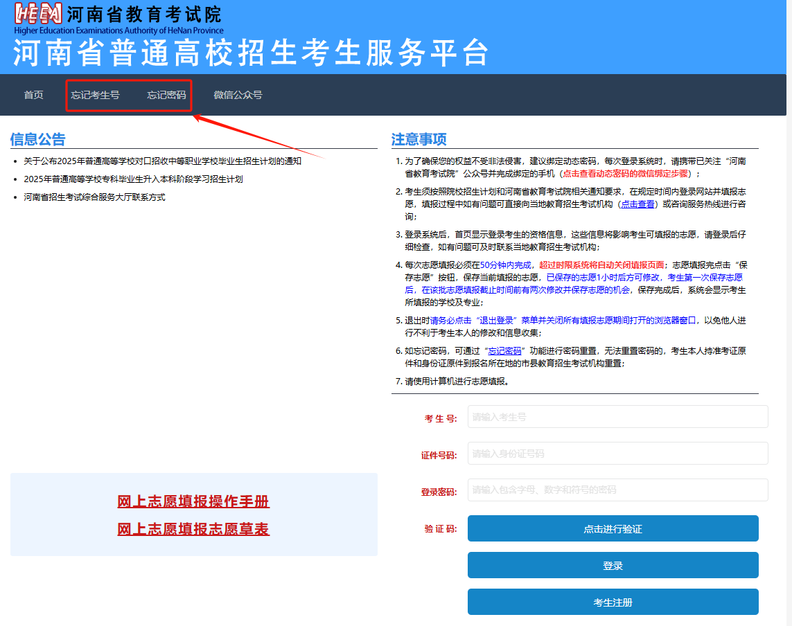 进入考生服务平台后,请仔细阅读“信息公告”区、“注意事项”区发布的政策公告和注意事项。