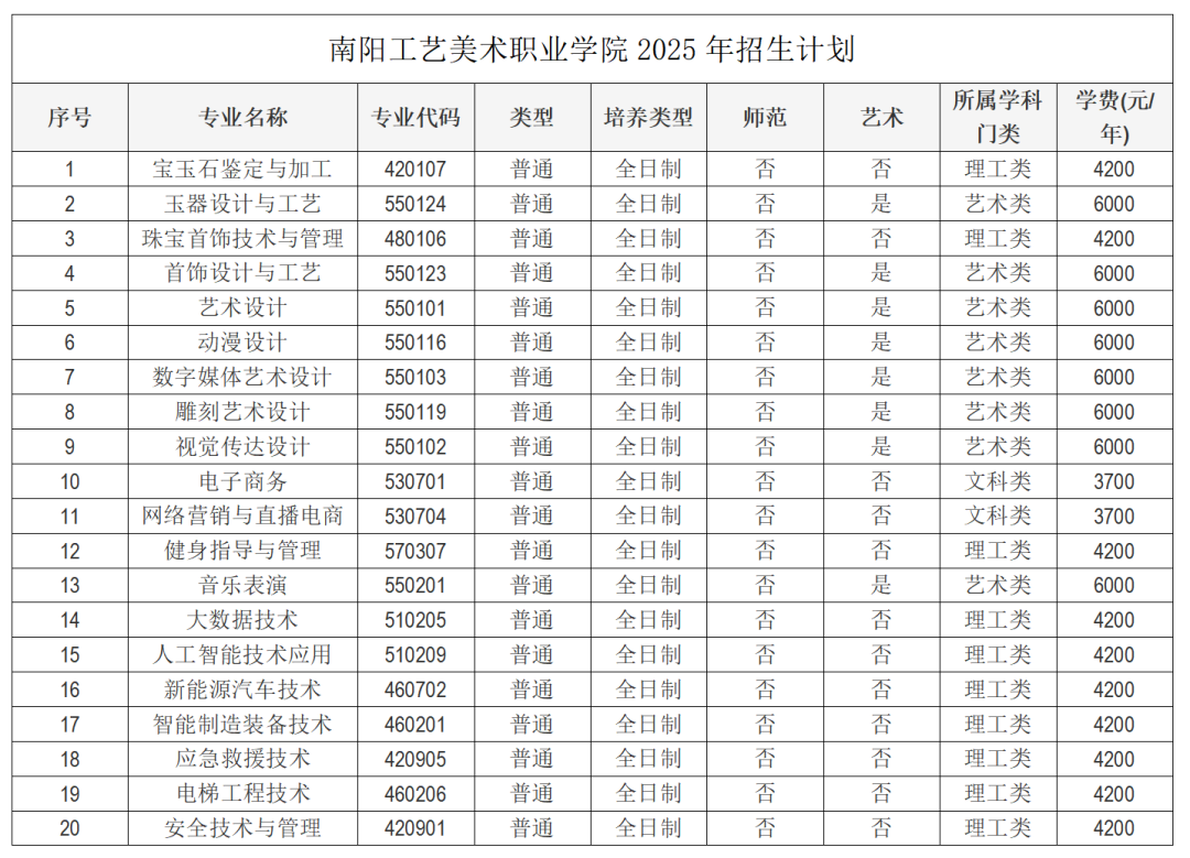 第十二条 招生专业:宝玉石鉴定与加工、玉器设计与工艺、珠宝首饰技术与管理、首饰设计与工艺、艺术设计、动漫设计、数字媒体艺术设计、雕刻艺术设计、视觉传达设计、电子商务、网络营销与直播电商、健身指导与管理、音乐表演、大数据技术、人工智能技术应用、新能源汽车技术、智能制造装备技术、应急救援技术、电梯工程技术、安全技术与管理。
