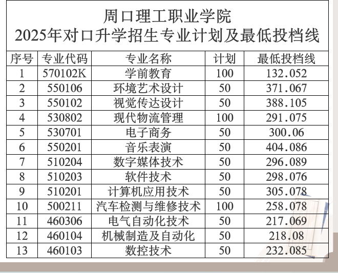 周口理工职业学院2025年对口升学最低投档线公布