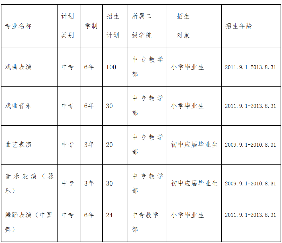 戏曲表演专业招收:六年制中专(招收小学毕业生)。