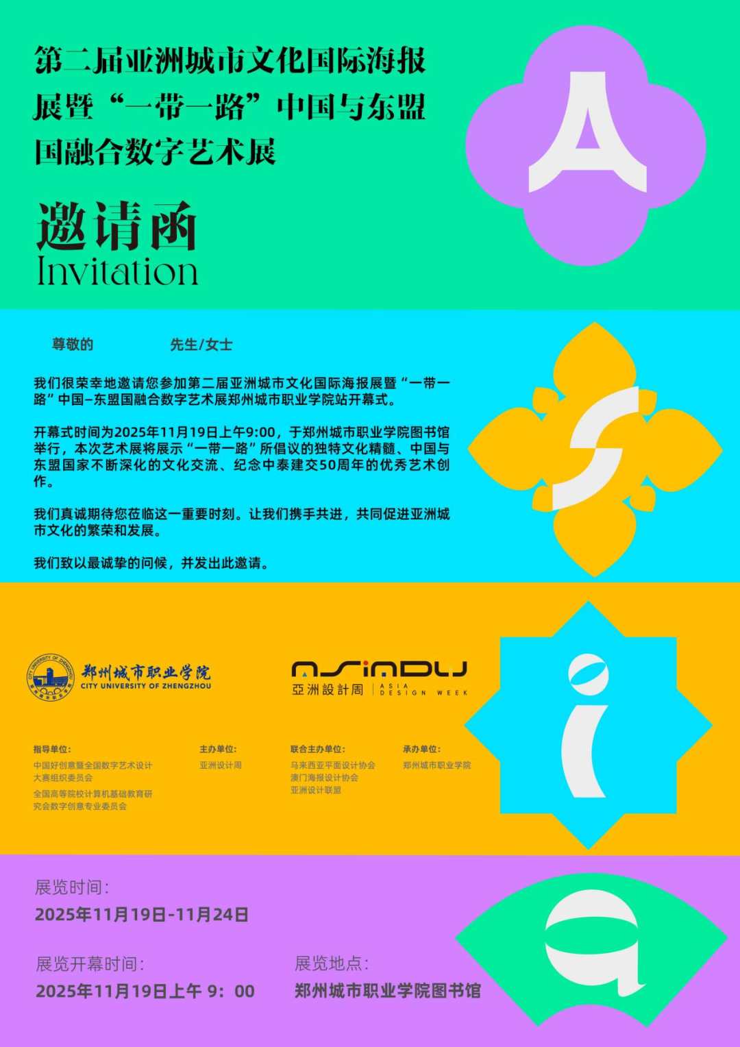 金秋时节,艺术与创意交融!由亚洲设计周组委会主办,马来西亚平面设计协会、澳门海报设计协会、亚洲设计联盟联合主办,郑州城市职业学院倾力承办的第二届亚洲城市文化国际海报展暨“一带一路”中国—东盟融合数字艺术展,将于2025年11月19日在郑州城市职业学院图书馆盛大开幕。我们诚挚邀请各界同仁、艺术爱好者共赴这场跨越国界的视觉盛宴!
