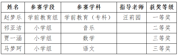 近日,河南省第二十三届高等学校师范类专业毕业生教学技能比赛结果揭晓。平顶山职业技术学院学子表现优异,共获一等奖1项、二等奖1项、三等奖2项。其中,儿童教育与发展学院赵梦乐同学(指导教师:汪莉园)获学前教育组一等奖;艺术学院祁亚洁同学获小学音乐学科二等奖;通识教育学院贾一涵同学、马梦珂同学分获小学组数学、语文学科三等奖。