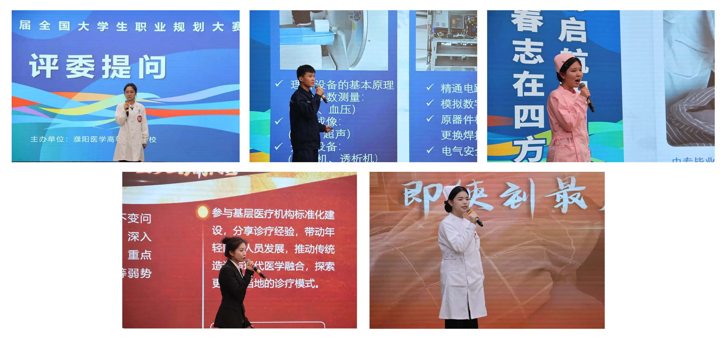 决赛现场,选手们精神饱满、沉着自信。成长赛道选手通过PPT与演讲,系统性展示自我认知、职业环境分析及目标规划;就业赛道选手则在个人展示和情景模拟中,展现扎实专业功底、实践能力、求职意向和职场潜力。两大赛道精准覆盖不同年级学生发展需求,勾勒出兼具可行性与前瞻性的职业蓝图,以理性思考回应时代需求,展现了清晰的职业思考与积极的奋斗姿态。选手们准备充分、表现沉稳,充分彰显了濮阳医专学子的职业素养与精神风貌。