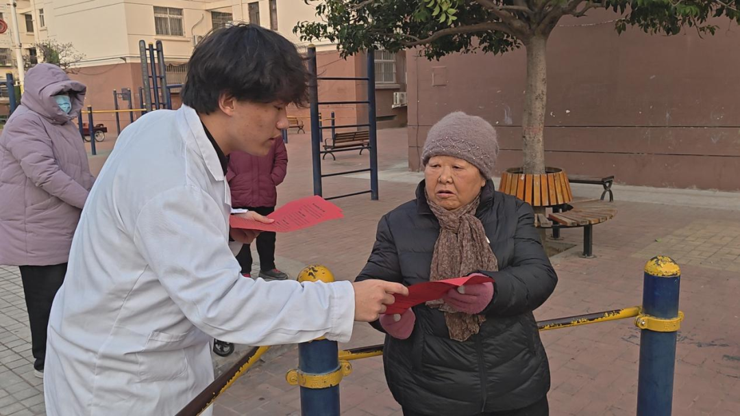 在宣讲互动环节,药学院学生带来了金银花、酸枣仁、丹参等濮阳道地药材。学生们手持药材,用通俗易懂的语言讲解鉴别方法和保健作用。中医学院学生借助针灸铜人开展科普互动,围绕铜人经络走向,重点介绍了足三里、合谷穴等常用保健穴位的定位方法,针对颈肩腰腿痛等常见问题,现场示范穴位按摩技巧。同学们还带领现场群众做起了中医养生“八虚操”,他们结合《黄帝内经》养生原理,逐一示范腋窝、肘窝、腹股沟、腘窝这“八虚”部位的拍打方法,详细说明不同部位对应的养生功效,以及饭后不宜立即拍打、老人力度需轻柔等注意事项。整齐划一的动作、通俗易懂的讲解,让老人们学得格外认真,现场气氛热闹非凡。宣讲活动结束后,药学院志愿者还向社区群众发放了用药健康指南。