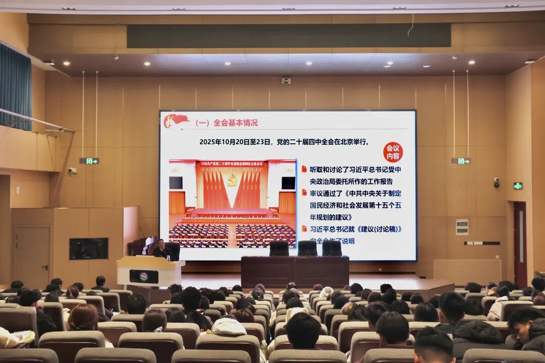 王庆志从国家五年规划的战略高度和深远影响切入,生动阐述了党的二十届四中全会的召开背景和重大意义。全会站在“十四五”规划收官与“十五五”规划谋篇布局的历史交汇点上,审议通过的《中共中央关于制定国民经济和社会发展第十五个五年规划的建议》,不仅绘就了国家未来五年的宏伟发展蓝图,更直接关系到每一位青年学子的成长成才,激励同学们要胸怀“国之大者”,找准自身定位。