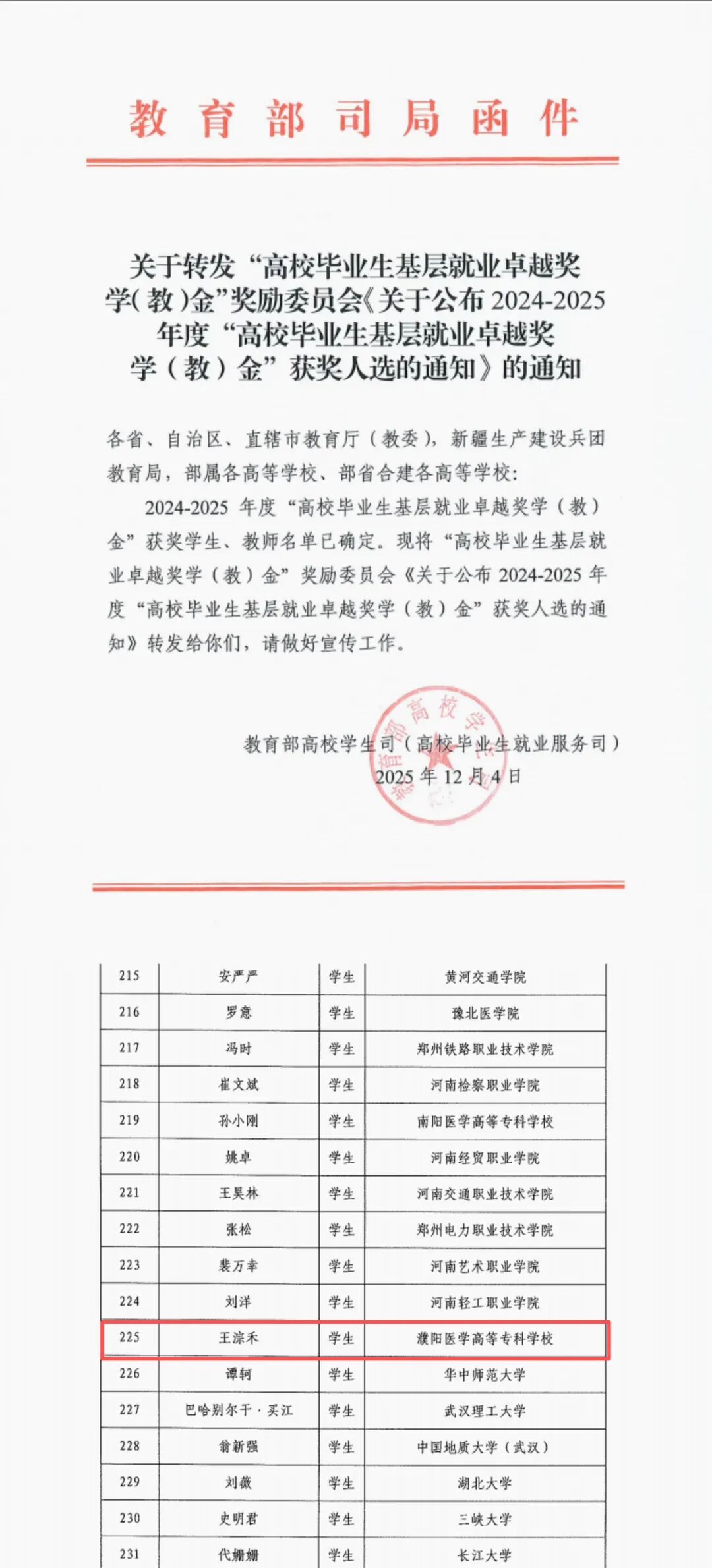 近日,教育部、中国教育发展基金会公布2024-2025年度“高校毕业生基层就业卓越奖学(教)金”获奖名单,濮阳医学高等专科学校毕业生王淙禾成功入选。