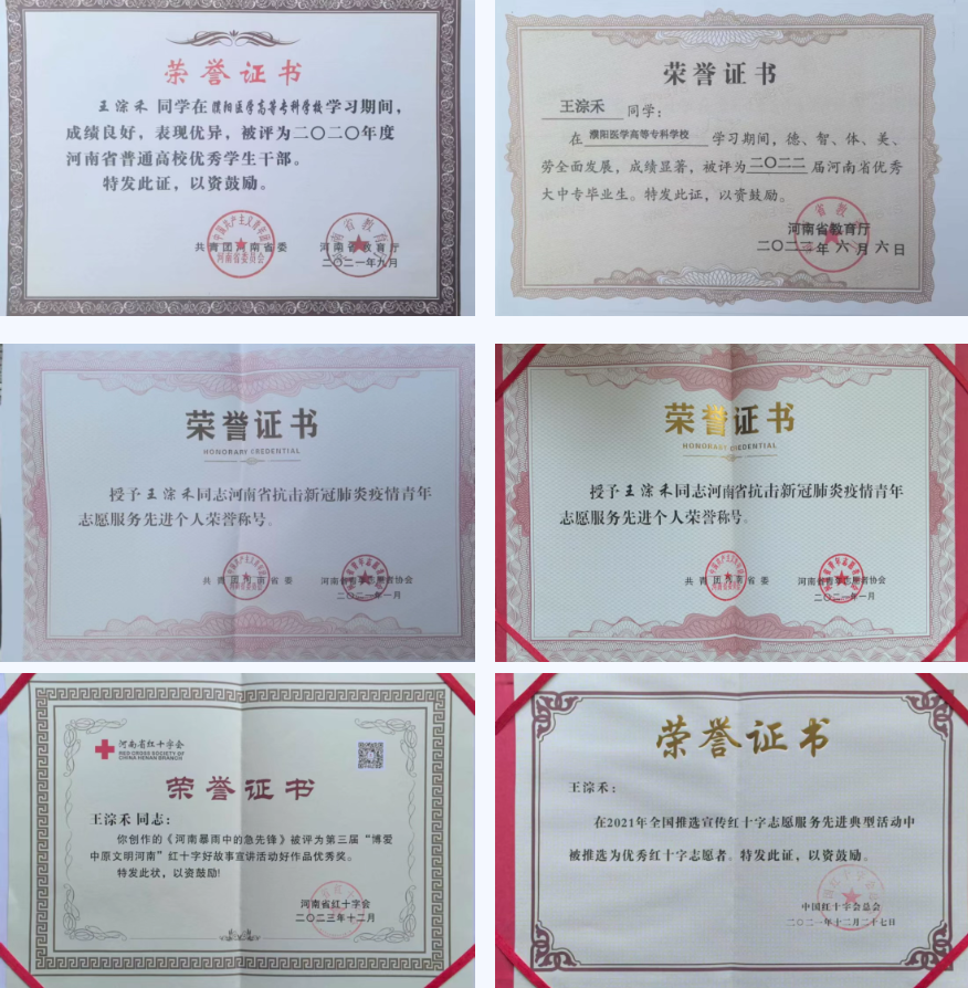 从濮阳医专学子到救援尖兵,王淙禾用行动书写了新时代青年的担当。先后获全国红十字志愿服务先进典型、中国大学生自强之星国家级荣誉2项;河南省抗击新冠肺炎疫情青年志愿服务先进个人等省级荣誉3项、市级荣誉6项。这些荣誉不仅是对他个人的肯定,更彰显了新时代高校毕业生服务社会的青春担当。