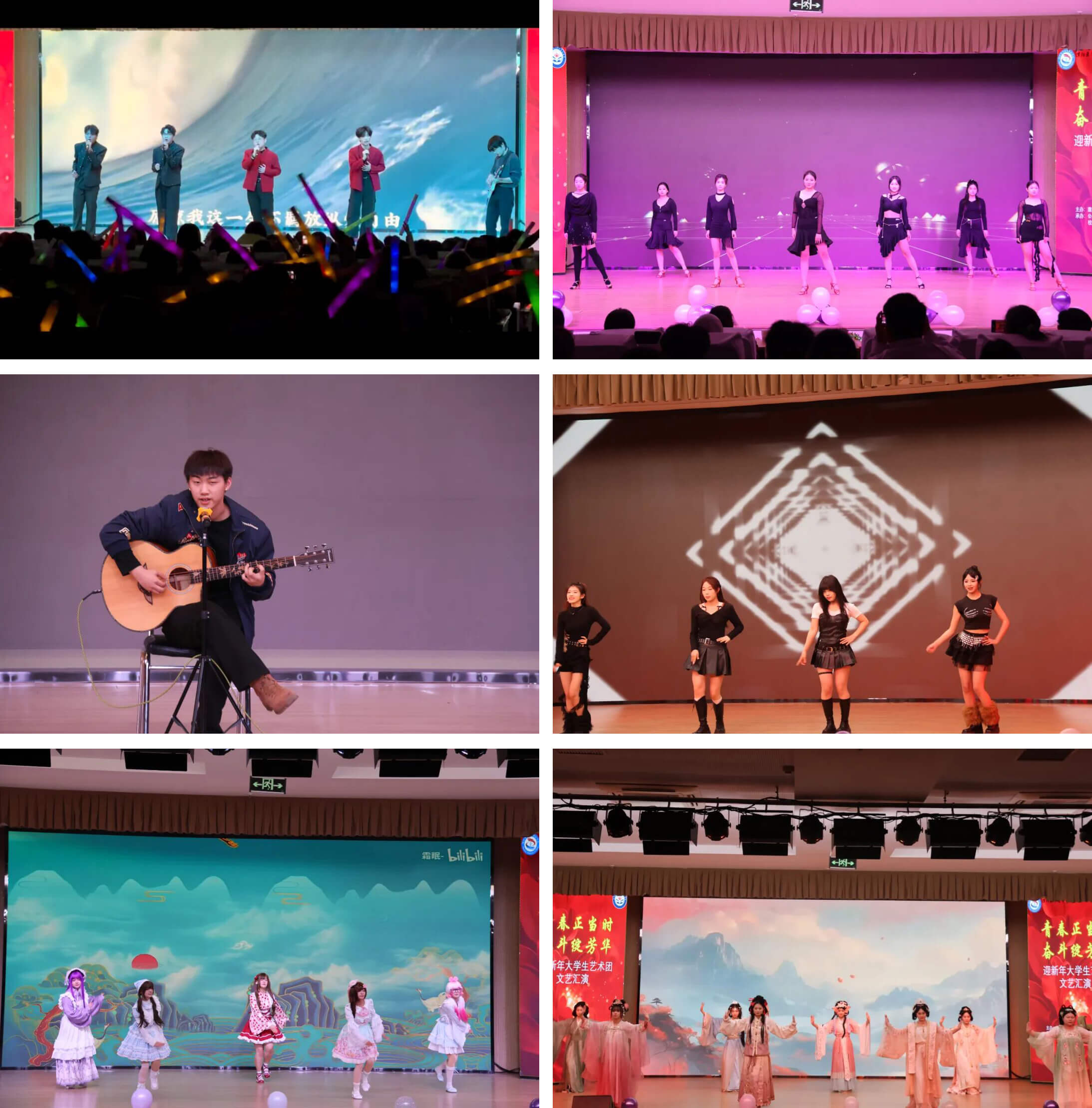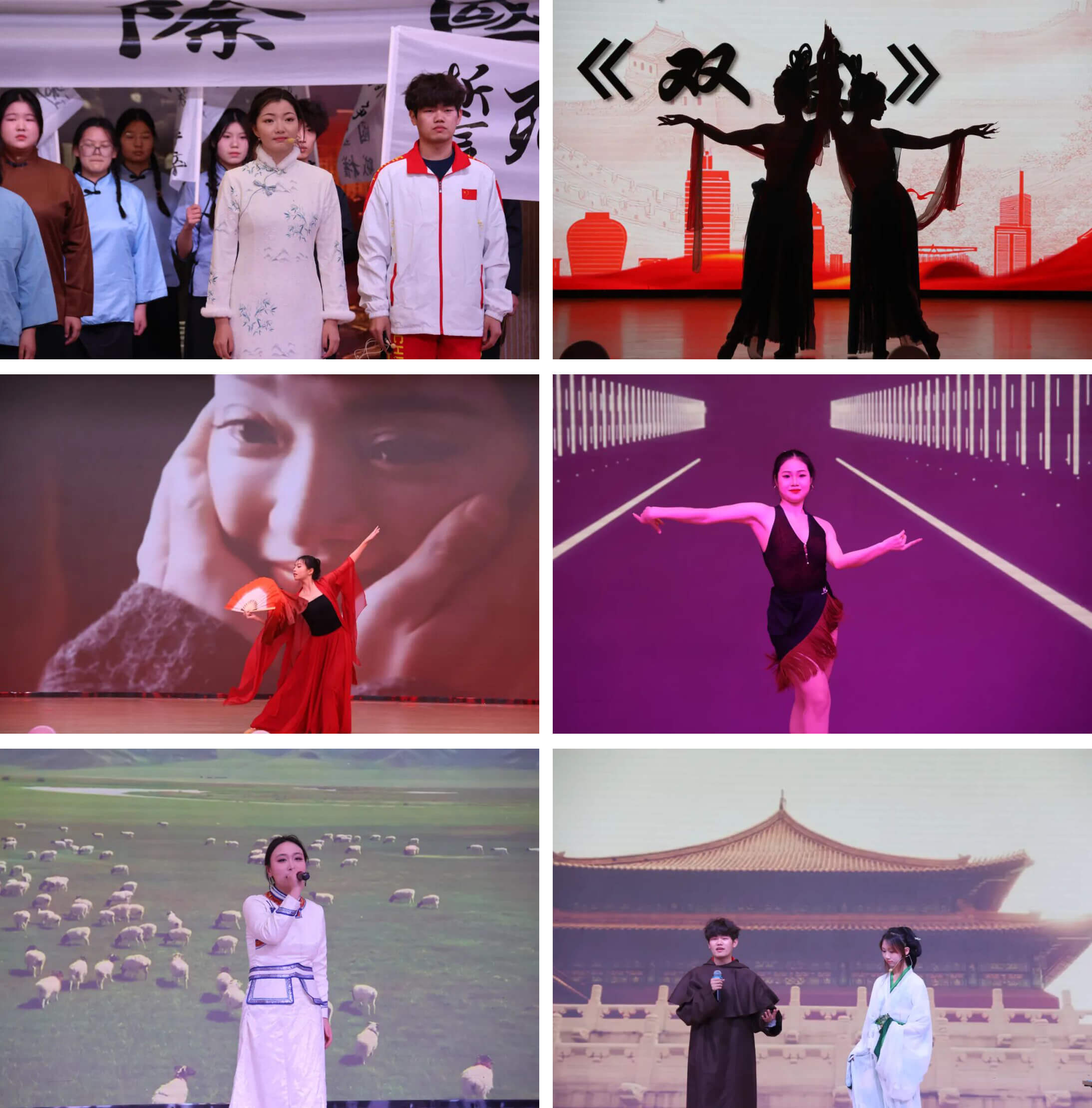 中华优秀传统文化展示节目《十二风华鉴》依托汉服扇子、棋、丝绸、剪纸、书画等十二种传统“文化宝贝”,传承中华传统文化之韵;歌舞《敕勒歌》以悠扬歌声传递民族风情之美;礼仪社的九零年代服饰走秀复刻时代芳华,动漫社的cosplay走秀展现次元文化的魅力;音乐社经典老歌的歌曲串烧,勾起师生共同的青春回忆,引起全场共同歌唱,将节目推向高潮。在这里,传承与创新交织,时光与青春共鸣。
