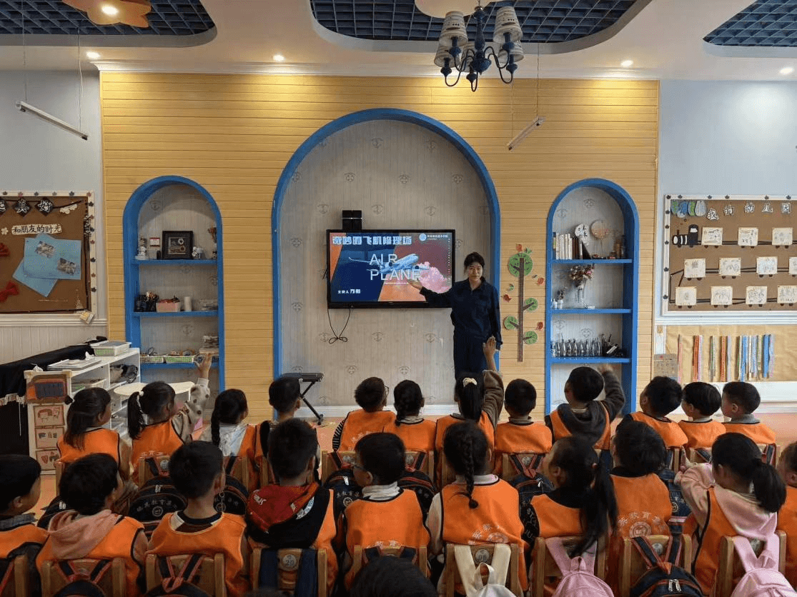 方怡与志愿队成员先后走进许昌本地小学、幼儿园等教育机构,围绕“飞机是如何飞起来的”“国产大飞机C919的故事”“维修师是做什么的”等主题,开展科普宣讲以及模型展示活动。活动中,她不仅展示飞机机电模型,还结合视频、图片等形式,用浅显易懂的语言向孩子们讲解航空知识,激发他们对航空科技的兴趣与好奇心。在实验幼儿园,她带领孩子们一起折叠“梦想号”纸飞机。一次次讲座后,“我将来也想造飞机!”“女生也能当机械师!”的稚嫩心声,成为活动最动人的回响。