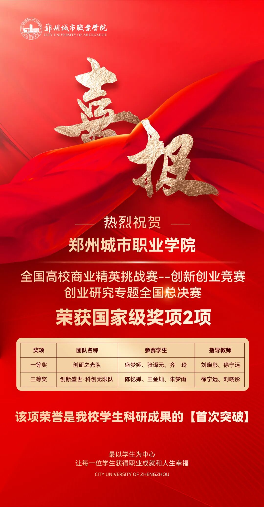 近日,在教育部认可的全国高校商业精英挑战赛创新创业竞赛创业研究专题赛道全国总决赛中,郑州城市职业学院首次组队参赛便惊艳全场,一举斩获全国一等奖1项、三等奖1项的优异成绩!两支获奖队伍均由2024级金融服务与管理专业学子组成,他们凭借扎实的专业功底、敏锐的商业洞察力与温暖的人文情怀,在全国舞台上充分展现了城院学子的创新活力与责任担当。