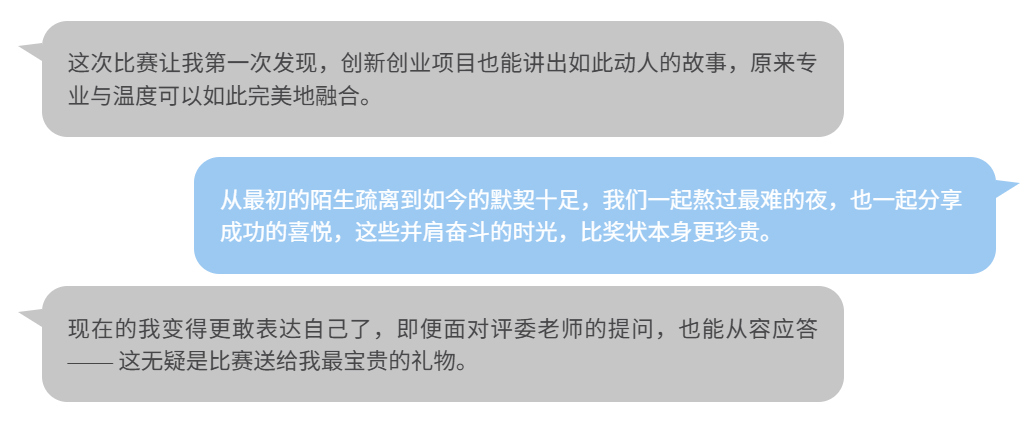 这次比赛让我第一次发现,创新创业项目也能讲出如此动人的故事,原来专业与温度可以如此完美地融合。