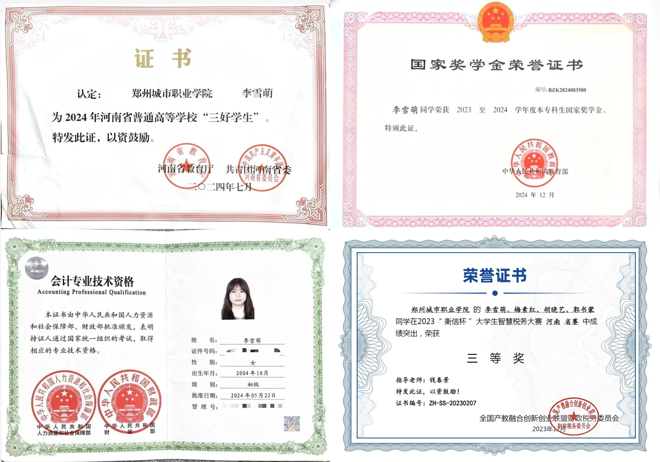 课堂上,她是专注思考的求知者,总能精准捕捉知识点的核心要义;校园中,她是热心服务的学生骨干,在“优秀班干部”的岗位上发光发热;学业上,她是追求卓越的奋进者,凭借不懈努力斩获初级会计师资格认证、国家奖学金、“三好学生”等多项荣誉。而“河南省优秀毕业生”这一沉甸甸的称号,更是对她三年勤勉付出的最高肯定,成为她大学时代最珍贵的纪念。