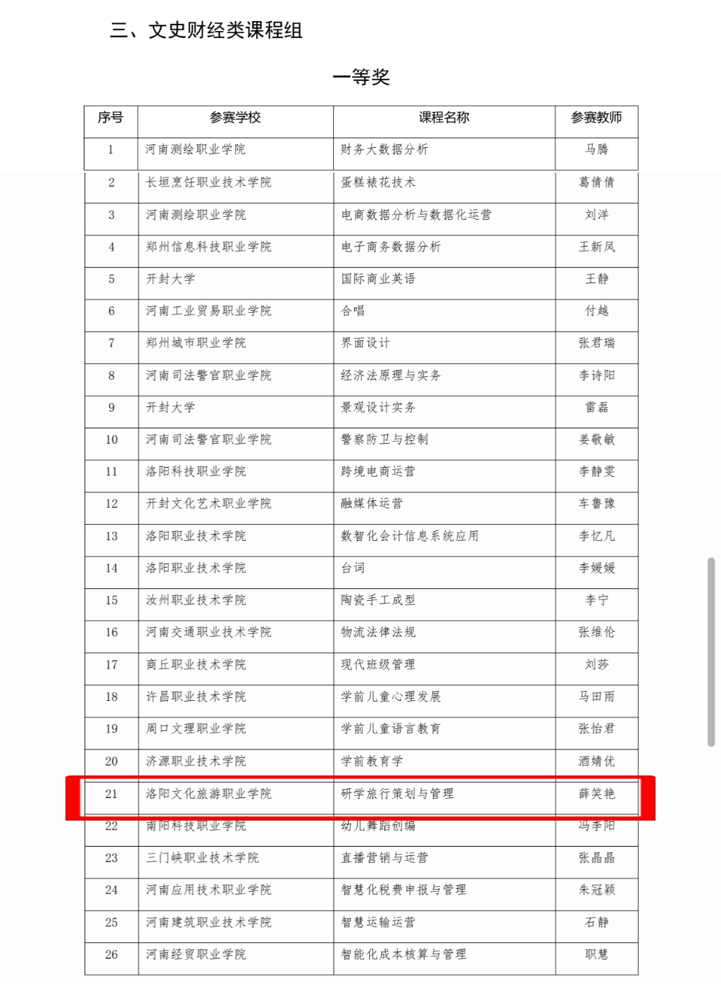 近日,河南省教育厅正式公示2025年河南省高等职业教育课堂教学创新大赛拟获奖名单,洛阳文化旅游职业学院薛笑艳老师主讲的《研学旅行策划与管理》课程凭借鲜明的创新特色、扎实的教学功底和突出的实践价值,在文史财经类课程组激烈角逐中脱颖而出,成功斩获一等奖!