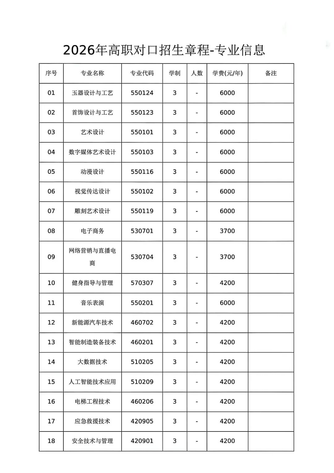 第十二条 招生专业:玉器设计与工艺、首饰设计与工艺、艺术设计、数字媒体艺术设计、动漫设计、视觉传达设计、雕刻艺术设计、电子商务、网络营销与直播电商、健身指导与管理、音乐表演、新能源汽车技术、智能制造装备技术、大数据技术、人工智能技术应用、电梯工程技术、应急救援技术、安全技术与管理。