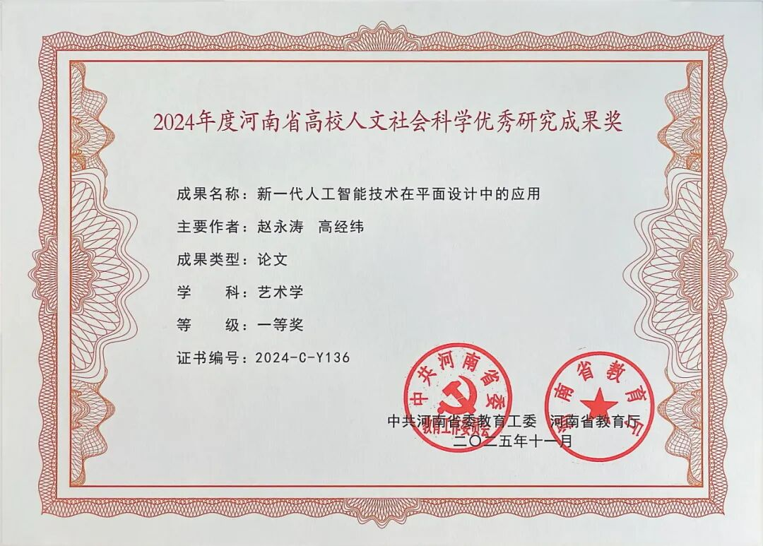 赵永涛教授牵头完成的论文《新一代人工智能技术在平面设计中的应用》荣获一等奖(证书编号:2024-C-Y136)。该研究聚焦人工智能技术与平面设计的深度融合,系统分析了新一代人工智能在平面设计领域的应用现状、现实问题与发展趋势。