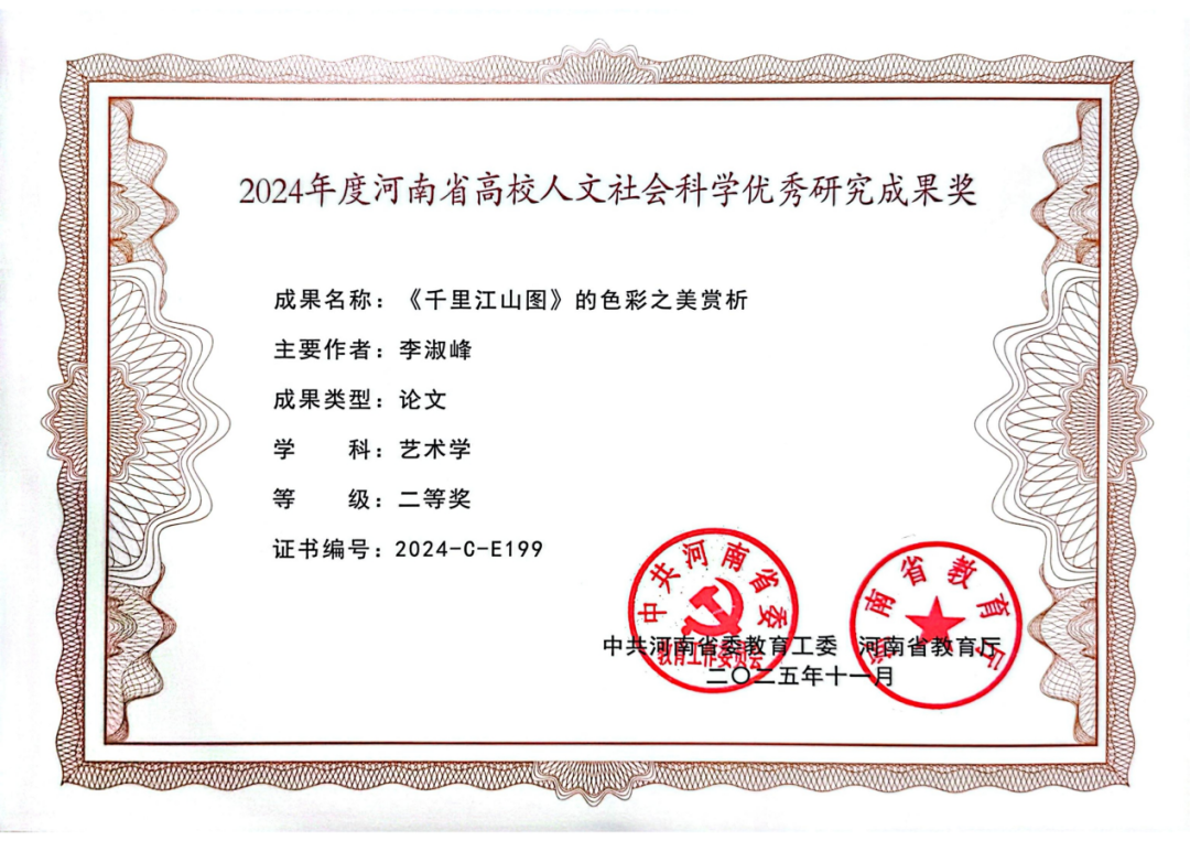 教师李淑峰撰写的论文《〈千里江山图〉的色彩之美赏析》荣获二等奖(证书编号:2024-C-E199)。该研究突破以往侧重构图考证和技法解析的研究范式,将“色彩”作为核心切入点,从色彩构成、构图协同、情感传达、技法融合和艺术魅力生成等多个维度,构建起系统而完整的分析框架。