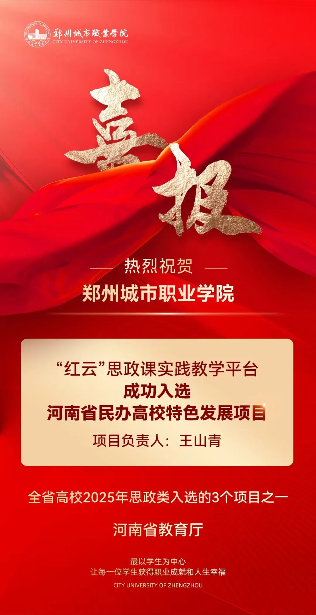 近日,河南省教育厅发布全省民办教育特色发展项目名单,确定48个民办高校特色发展项目,集中展现了河南省民办高校在特色发展道路上的探索成果。郑州城市职业学院“红云”思政课实践教学平台入选,是高校特色发展项目的重要代表。