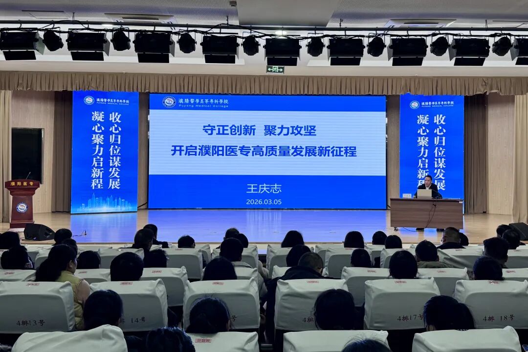 3月5日下午,濮阳医学高等专科学校在易明楼报告厅召开2026年春季学期全校教职工大会。在校领导班子成员出席会议,全体教职工500余人参加会议。会议由校长王庆志主持并讲话。