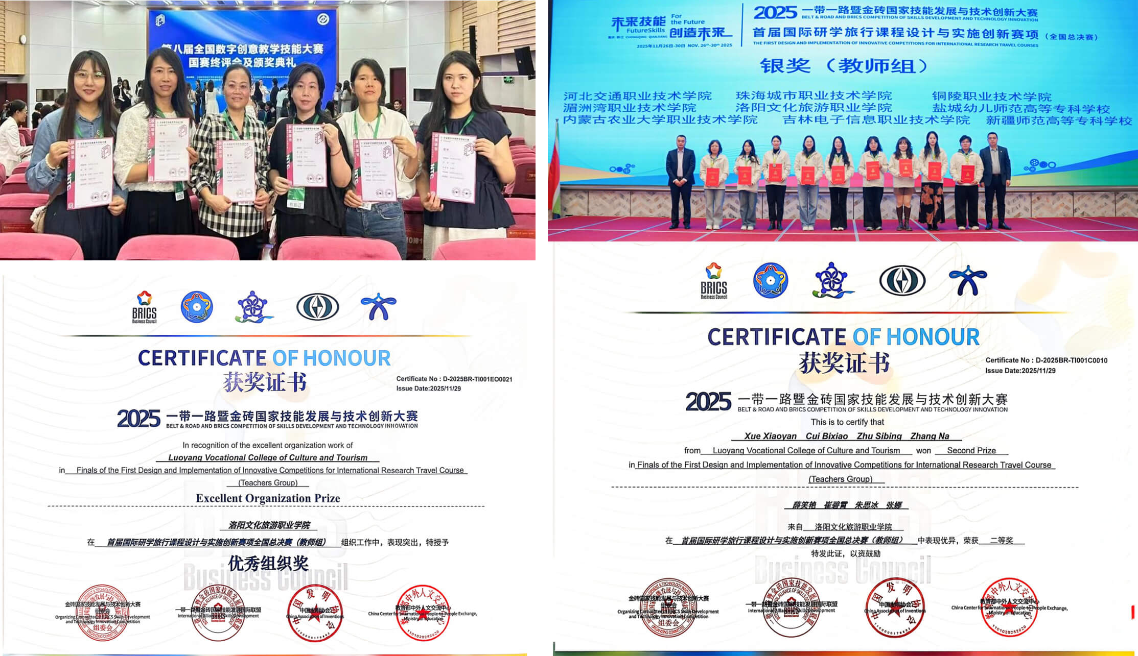 值得一提的是,项目负责人张功岭老师受教育部艺术设计指导委员会邀请主讲的非遗技艺传承专题报告,成功上线国家教育部智慧职教课程资源;在第八届全国数字创意教学技能大赛国赛激烈角逐中,张功岭老师凭借出色的教学设计与扎实的专业素养,从全国众多参赛队伍中脱颖而出,荣获全国二等奖;团队主要成员朱思冰老师与其他成员协同攻坚、奋勇争先,在2025一带一路暨金砖国家技能发展与技术创新大赛首届国际研学旅行课程设计与实施创新赛项全国总决赛中,荣获教师组二等奖,学校也因赛事组织工作成效突出,被评为“优秀组织奖”。