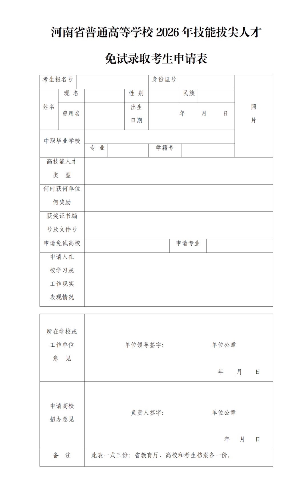 1.考生本人填写《河南省普通高等学校2026年技能拔尖人才免试录取考生申请表》(可在我校招生信息网下载),提出免试入学申请,由生源学校负责确认考生获奖情况。