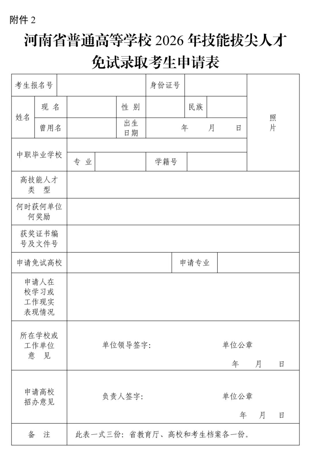 附件2 河南省普通高等学校2026年技能拔尖人才免试录取考生申请表