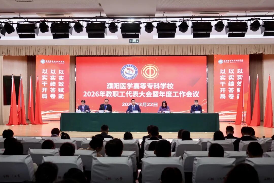 3月22日下午,濮阳医学高等专科学校2026年教职工代表大会暨年度工作会议在易明楼大报告厅召开。在校领导班子成员出席。全体教职工齐聚一堂,总结过往、共谋发展。会议由党委副书记何美玲主持。