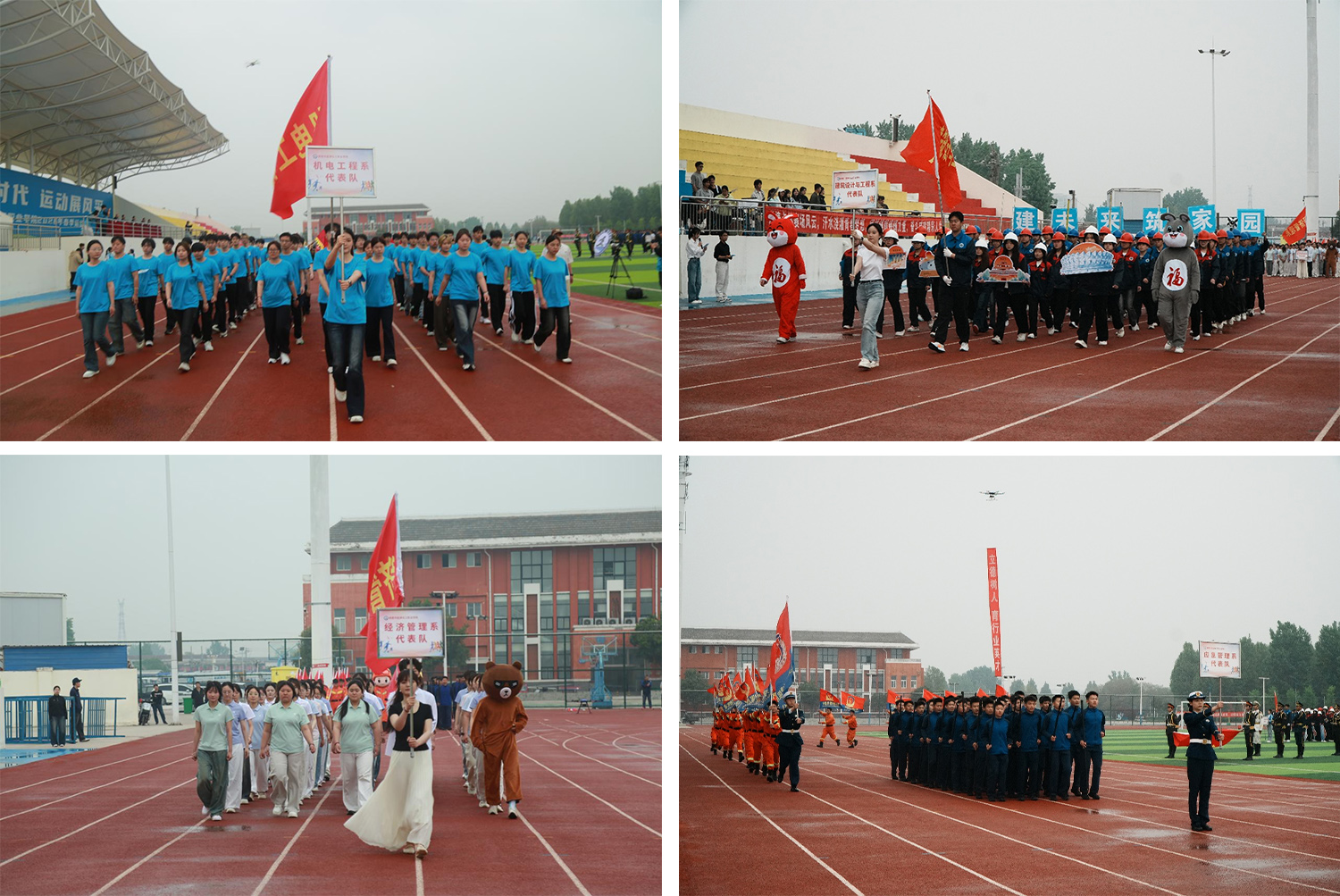 伴随着激昂的《运动员进行曲》,入场式正式开始。国旗护卫队、会徽方队步伐铿锵,庄严入场。裁判员方队以六列纵队整齐亮相。随后,电子信息工程系、能源化工与安全工程系、机电工程系、建筑设计与工程系、经济管理系、应急管理系等6个院系代表队依次登场,在引导员和旗手带领下走向主席台。