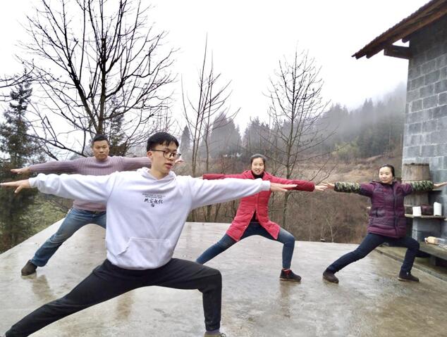 图为2018级社会体育指导与管理专业学生朱奥带领全家人一起练瑜伽