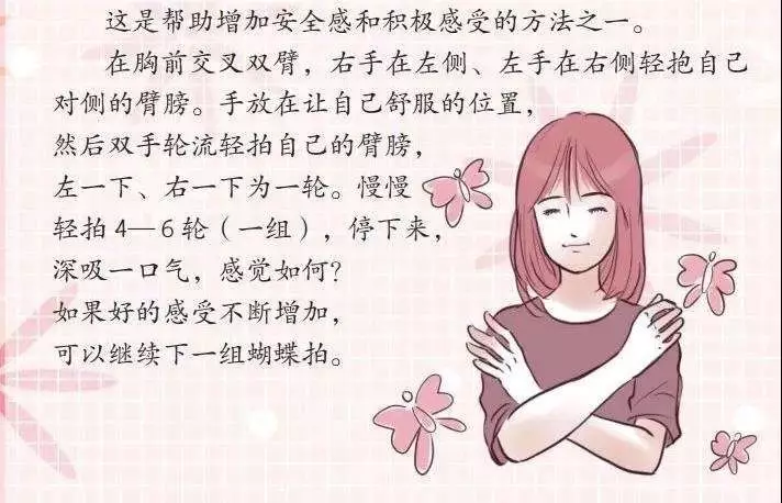 (2)照顾好自己的情绪:找熟人聊聊天;听听另自己愉悦放松的音乐 (链接见公众号“武音心理健康教育与音乐治疗中心”音乐疗愈电台);蝴蝶拍拍,安抚自己(蝴蝶拍的具体步骤如下图)。