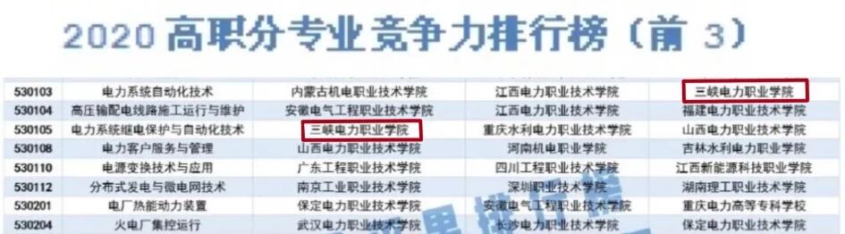 其中,在2020高职分专业竞争力排行榜中,三峡电院电力系统继电保护与自动化技术专业位列全国第1,电力系统自动化技术专业位列全国第三。