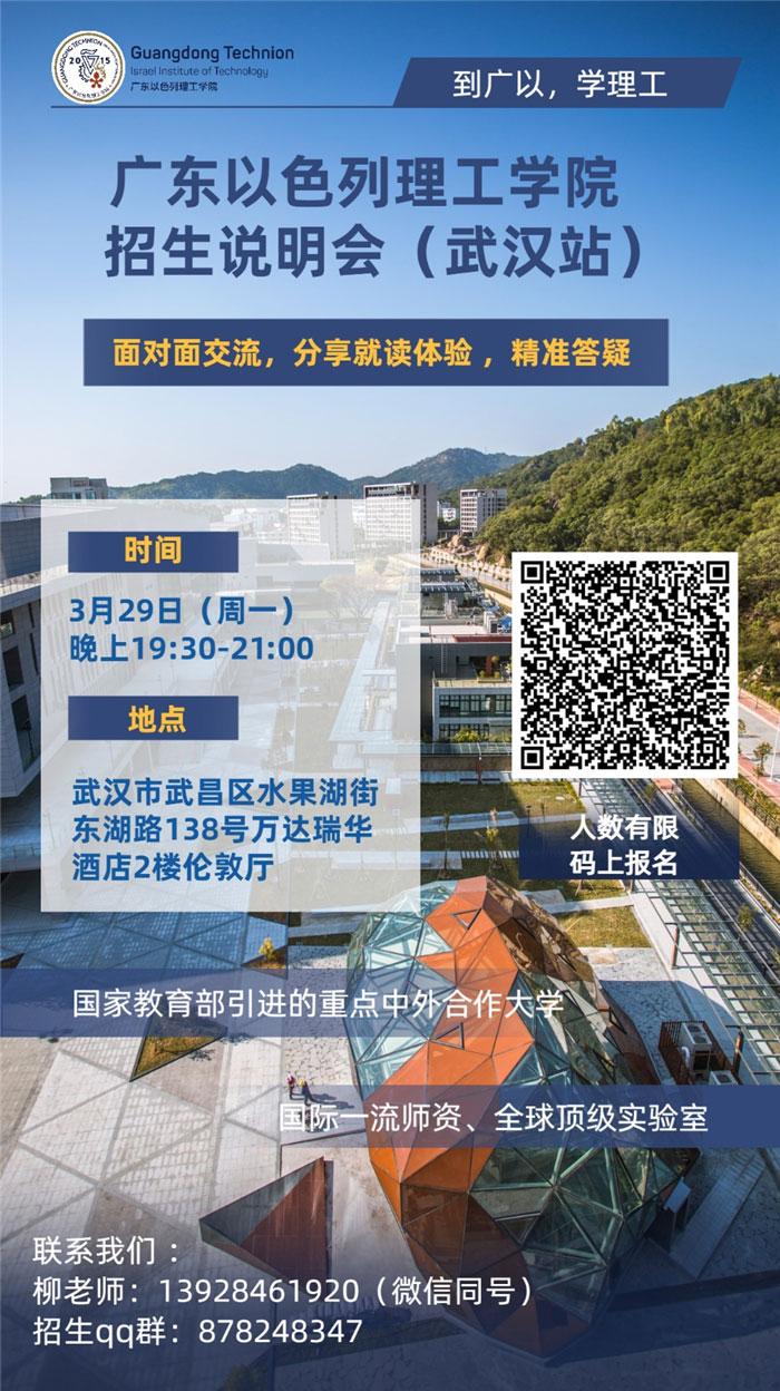 中国教育在线讯 2021年高考,广东以色列理工学院老师正奔赴各地举行招生宣讲活动。3月29日(下周一),将在武汉举行招生说明会,面对面交流,为考生提供报考建议及一对一指导。欢迎对理工科感兴趣的同学和家长预约报名!