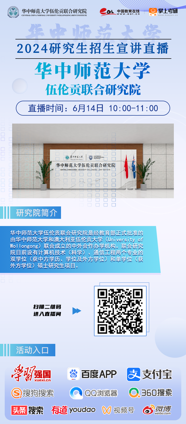 直播预告|6月14日,华中师范大学伍伦贡联合研究院2024研究生招生直播咨询会即将开启!