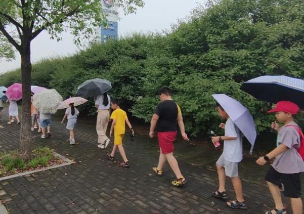 徒步队伍排成两列纵队向2公里的目的地前进,志愿者们分散于队伍的前中后三部分,以此来确保孩子们的安全问题。即使天公不作美下起了毛毛细雨,孩子们依旧热情高涨没有抱怨。同行的家长在队伍旁感慨:“开始还替孩子们担心,怕他们坚持不下来。看到他们所有人都走下来,才发现是自己担心多余。专业的事情还需专业的人来做。志愿者很好的把握了这个量。孩子们真的很厉害,这种经历一定会给他们以后人生带来更多感悟,感谢老师们给孩子们这种体验和真诚呵护,这种坚韧不拔的精神或许在某天就会得到激发”。