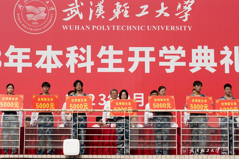 武汉轻工大学校领导为2023级普通本科优秀新生奖学金获得者颁奖,为新生代表佩戴校徽,勉励他们秉承“明德、积学、砺志、笃行”的校训精神,续写轻工大的使命与荣光。