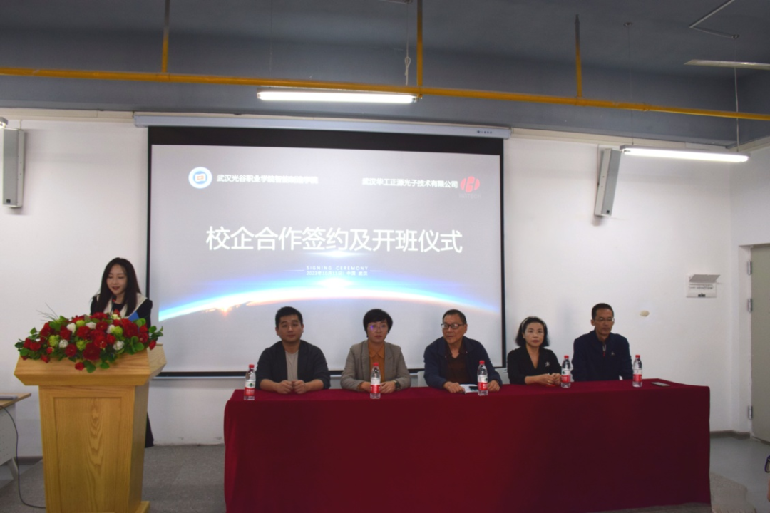 为深化产教融合,创新人才培养模式,拓宽学生实习与就业渠道,武汉光谷职业学院智能制造学院与武汉华工正源光子技术有限公司校企合作签约及开班仪式在综合楼H301报告厅顺利举行。武汉光谷职业学院院长黄诚驹、副院长孙俊梅、院长助理李锦华,武汉华工正源光子技术有限公司产品研发部高级经理黄惠、武汉华工正源光子技术有限公司人力资源部高级经理张涛参加签约仪式。签约仪式由订单班辅导员王子纯老师主持。