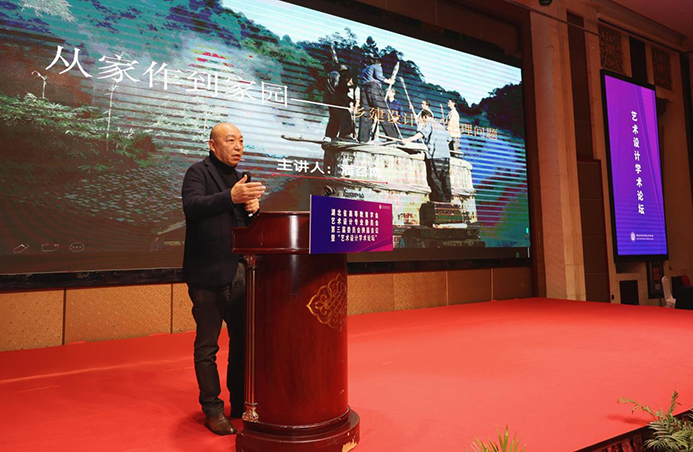 在学术交流环节中,由广西艺术学院学报编辑部主任李永强担任主持,四川美术学院教学实验中心主任潘召南、华中师范大学美术学院副院长郑达分别以《从家作到家园——乡建设计中的伦理问题》和《智能时代的“自主性”艺术与设计》为主题分享了艺术设计方案报告。