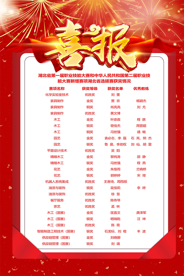 近日,湖北省人力资源和社会保障厅下发《关于公布湖北省第一届职业技能大赛和中华人民共和国第二届职业技能大赛新增赛项湖北省选拔赛获奖名单的通报》,湖北生态工程职业技术学院在湖北省第一届职业技能大赛和中华人民共和国第二届职业技能大赛新增赛项湖北省选拔赛中的家具制作、木工、园艺、精细木工、供应链管理(国赛)、木工(国赛)等14个项目获得25个奖项,其中金奖7项、银奖8项、铜奖2项,优胜奖8项。杨颖杰、刘尤、程朕、周晋超、石亮等17名教师获得“优秀教练”,学校获得突出贡献单位。