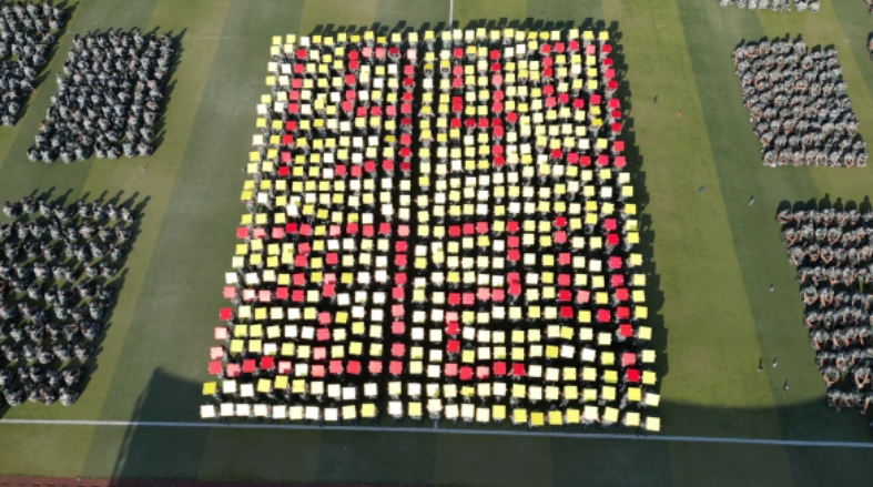在阵阵鼓掌声中,花样方阵学生奔跑上场,他们口号响亮,手中的红黄方板,随着口号声的节奏不停变换颜色。从庆祝新中国七十五周年的数字图案,到中国版图和敬礼,在翻出最后一个词组图案时,学生们齐声喊出“祖国万岁!”。