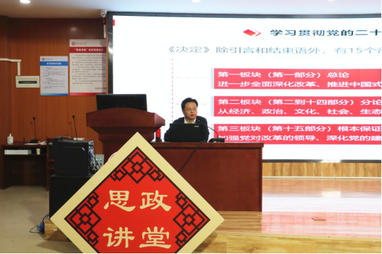 陈志祥聚焦党的二十届三中全会通过的《中共中央关于进一步全面深化改革、推进中国式现代化的决定》重要精神,围绕湖北区域发展定位,以及学生专业特色,以“进一步全面深化改革”为什么改、向哪里改、该怎么改三个核心问题,通过翔实准确的数据和经典案例引导学生学习理解“进一步全面深化改革”的主题、指导思想、主要目标、重大原则,并从体制、机制、制度等多层面阐述“进一步全面深化改革”的系统部署。