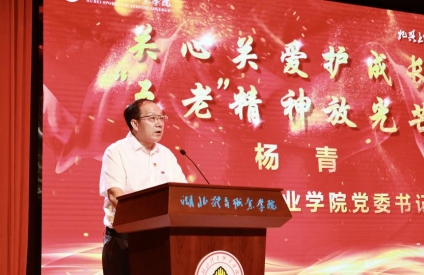 湖北体育职业学院党委书记杨青以《关心关爱护成长“五老”精神放光芒》为题发表了热情洋溢的欢迎词。他指出,湖北省关工委长期以来致力于青少年社会主义核心价值观教育,助推青少年健康成长。你们华发苍颜,却初心不改;你们年高德劭,仍志在千里。秉持“离岗不离党、退休不褪色”的理想信念,老当益壮、老有所为,用实际行动诠释着“忠诚敬业、关爱后代、务实创新、无私奉献”的“五老”精神。以“幼吾幼以及人之幼”的博爱和情怀,走进青少年,以鲜活语言、动人故事,讲述党的历程、英雄事迹、革命传统,将红色种子播撒进年轻的心灵,让红色基因注入下一代的精神血脉!