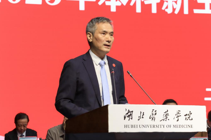 开学典礼上,新生代表陶思涵、老生代表林文瑶、教师代表刘睿分别发言,分享与湖医药的初心故事,号召同学们坚定理想信念,勇于追逐梦想,在湖北医药学院这片沃土上书写最美的青春篇章。