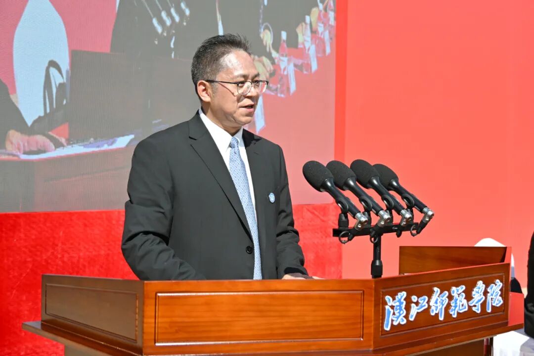 与会领导为新生代表佩戴校徽,象征他们正式成为新汉师人。新生代表、文学院本科生谢张涵同学以《从天山到汉水携初心赴新程》为题发言,深情讲述从天山脚下来到汉水之滨的求学初心,分享了自己对习近平总书记几次重要回信精神的理解与领悟,表达了对汉师精神的理解与传承之志。新生代表、教育学院专科生袁贤雯同学以《以青春之名,赴时代之约》为题表达了对汉江师范学院的向往与初入校园的喜悦,分享了军训带来的成长与感动,并向教官和老师们致以感谢。她特别提到汉师深厚的文化底蕴和“守水育人”的责任担当,渴望加入“守井人”行列,践行使命。