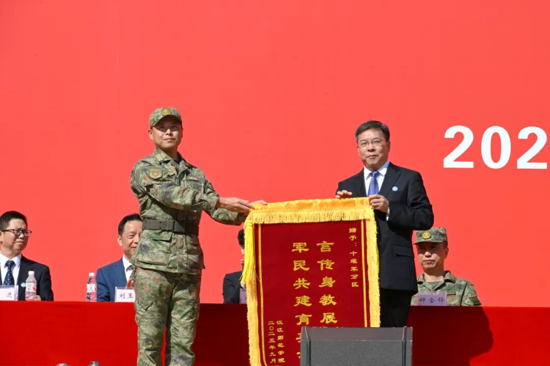 付永昌代表学校向十堰军分区赠送锦旗,感谢对军训工作的大力支持,续写“军校携手育英才”的深厚情谊。