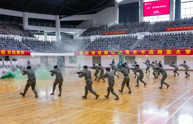 在随后的军训科目汇报中,同学们依次进行了军体拳、叠被子、刺杀操、战术演练等军训科目展示。迅猛有力的擒敌动作、娴熟灵巧的内务整理、敏捷矫健的刺杀操练、配合默契的战术方阵,整齐划一、衔接流畅,一招一式都透露出军人般的刚毅与果敢,彰显了武汉东湖学院2025级新生昂扬向上、拼搏进取的精神风貌。