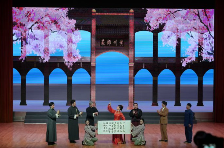 “一山复一山,一岭高一岭。学堂遍黄冈,处处读书声。百年老师范,代代铸师魂。初心似红烛,不畏霜天永放光明。”9月22日晚,根据教育部、文化和旅游部、财政部2025年“高雅艺术进校园”活动安排,黄冈师范学院大型原创黄梅戏音乐剧《霜天红烛》在宁夏中卫市职业技术学校震撼上演。