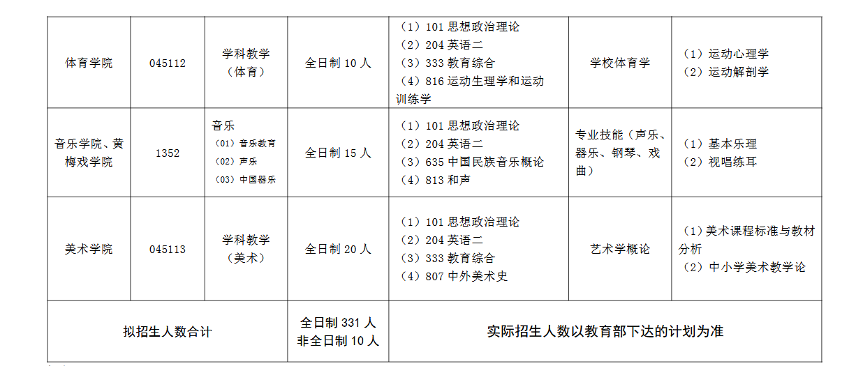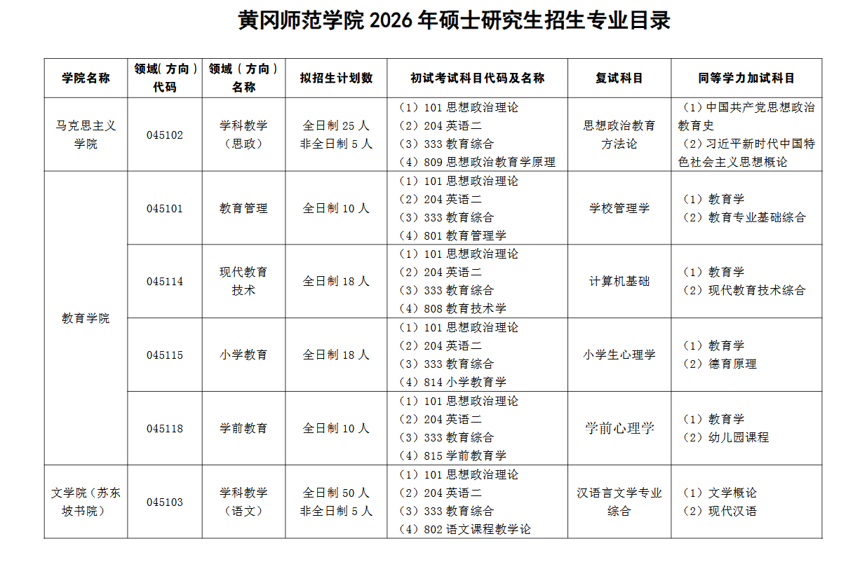 (2)黄冈师范学院2026年硕士研究生招生考试初试科目分别为101思想政治理论(科目1)、204英语二(科目2)、业务课一(科目3)、业务课二(科目4),满分分别为100分、100分、150分、150分。其中,101思想政治理论、204英语二、333教育综合为全国统考科目:其余为自命题科目。