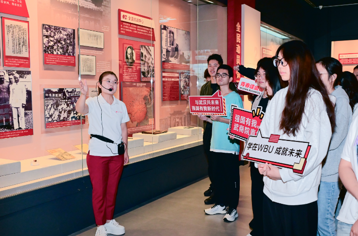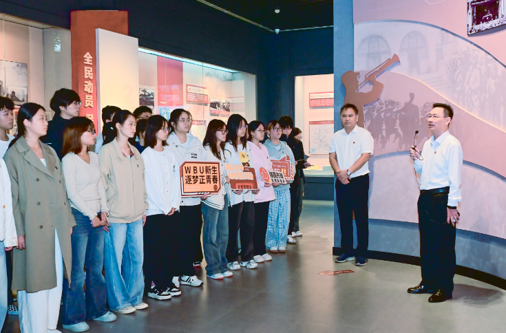 9月25日,武汉商学院党委副书记、校长彭瑜在武汉革命博物馆内,以“铭记抗战历史,传承抗战精神”为主题,为工商管理学院30余名新生讲授“开学第一课”。这堂特殊的思政课,既让青年学子从抗战历史中汲取成长力量,更让馆藏抗战文物成为滋养青春的“活”教科书。