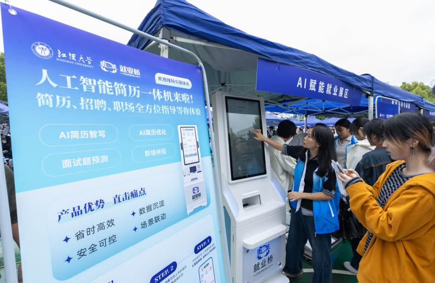 现场设立政策咨询、职业指导、简历诊断专区,提供“政策、岗位、培训、服务、指导”“五位一体”就业服务。学生通过AI求职机优化简历、模拟面试,以科技赋能明晰职业定位、提升竞争力。
