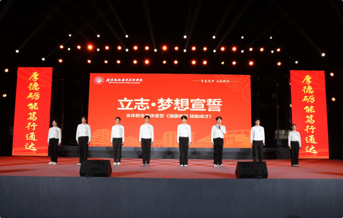 “我以青春之名庄严宣誓:立志技能报国,锤炼过硬本领;恪守校训精神,尊师重道,勤学笃行;追求工匠品格,精益求精,创新进取;勇担时代使命,强国有我,奋斗无悔!努力成为中国特色社会主义事业合格建设者和可靠接班人。”2025级新生集体宣誓《强国有我 技能成才》,掷地有声,响彻全场。